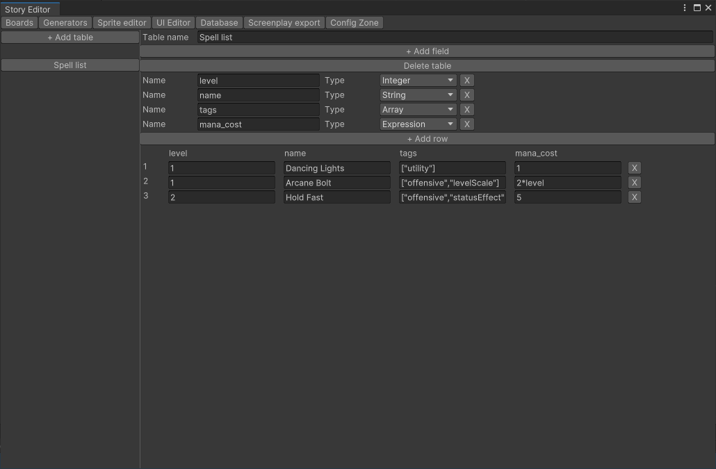 The database allows you to describe data tables: lists of entities in your game. Data tables can be used to store information about characters, items, clues, or any other type of object that might appear in your game. With a data table, you can edit this information in a central place, then use it in the game when needed. It’s especially useful for adding simulation and RPG elements to your game.