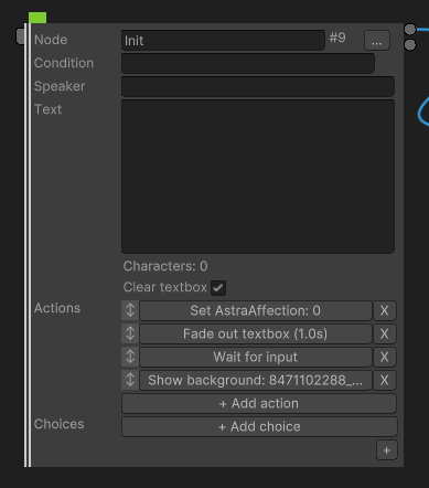 Wait for inputaction (in the “Variables and events” section). This will cause the game to wait for a click before progressing onto the next node - if we don’t use it, the game will flow straight through into Astra’s first line, bringing the textbox straight back up again to block our view. There aren’t any parameters on this action. - The