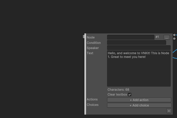 Weāll have Astra like us more when we tell her weāre ready to use VNKit, so on the Node just after we have done this, we will add an Action and set a variable representing Astraās emotions.